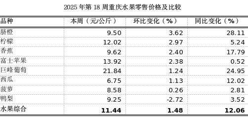 第18周我市各区县农贸市场8个大宗、时令水果监测品种总体零售均价11.44元,环比、同比分别上涨1.48%、12.06%。国内各地水果丰产,樱桃、枇杷、桑葚等小众水果丰产,苹果、梨、葡萄等大众水果同时上市,水果市场供应充足,价格略微走高。其中脐橙、柠檬、香蕉、富士苹果略涨3.62%、2.97%、2.40%、2.38%,鸭梨略跌2.72%,其余水果价格保持平稳。