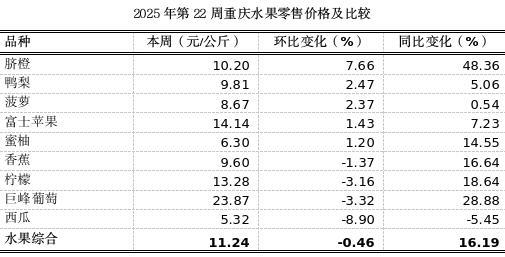 第22我市各区县农贸市场9个大宗、时令水果监测品种总体零售均价11.24元,环比下滑0.46%、表现平稳,同比上涨16.19%。天气转热,葡萄、菠萝、桃子等应季新鲜水果上市量增加,柑橘类水果售卖接近尾声,价格基本稳定。其中脐橙、鸭梨、菠萝分别涨7.66%、2.47%、2.37%,西瓜、葡萄、柠檬分别跌8.90%、3.32%、3.16%,其余水果价格保持平稳。