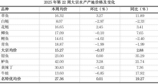 据市农业农村委监测,第22周重庆大宗水产产地均价15.27元/公斤,环比下滑0.37%、表现平稳,同比小幅上涨2.88%。水产品逐渐进入夏季传统消费旺季,叠加端午节日效应,市场需求较为旺盛,水产市场行情较好,养殖户出塘积极性高,供应量充足,价格整体平稳运行,后期气温逐渐升高,运输损耗成本增加,外地鱼流通减少,预计价格将向上波动。名特优水产均价27.36元/公斤,环比持平,同比上涨19.27%。