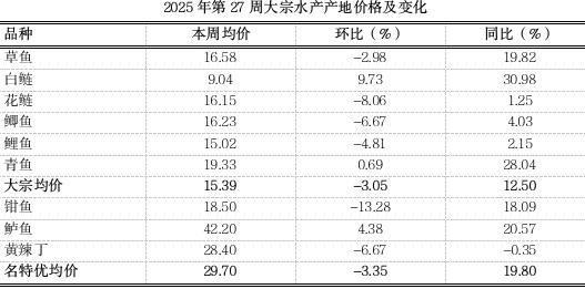 五、水产产地价格下跌,批发方面交易量增价跌,零售价格小幅下跌