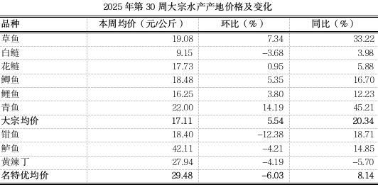据市农业农村委监测,第30周重庆大宗水产产地均价17.11元/公斤,环比上涨5.54%,同比上涨20.34%。进入夏季水产消费旺季,市场行情较好,加之外地鱼流通减少,前期价格呈持续上涨趋势,随着新鱼陆续达上市规格,养殖户出塘积极性高,市场供应量增加,消费需求趋于稳定,价格小幅回落,近期受持续高温影响,运输储存成本增加,部分水产价格止跌回涨。名特优水产均价29.48元/公斤,环比下跌6.03%,同比上涨8.14%。