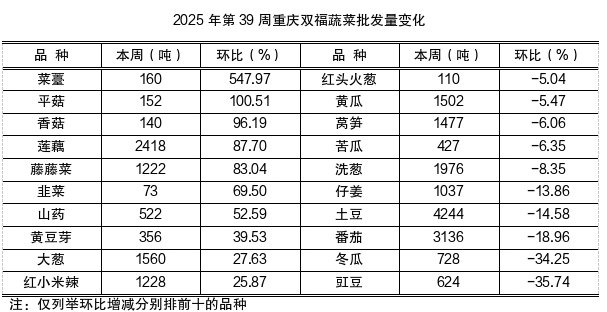 第39周蔬菜批发量表现28增11减3平稳,总批发上市量50663.36吨,环比小幅增加5.20%,同比小幅减少5.02%。其中,大宗蔬菜批发品种(周批发总量超过700吨)29个,批发量46764.77吨,环比小幅增加4.27%,同比略减3.85%,占总批发量的92.49%。大宗品种排名前10的品种:土豆4244吨、莲花白3627吨、番茄3136吨、老姜2792吨、青椒2501吨、莲藕2418吨、白萝卜2257吨、洗葱1976吨、四季豆1752吨、大葱1560吨。(增减幅前十位品种见下表)