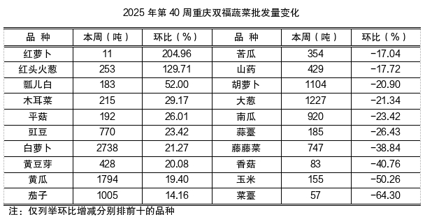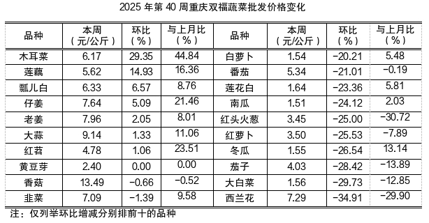 第40周蔬菜批发价格环比34跌7涨2平稳,总体算术批发均价5.21元(为公斤价,以下同),环比明显下跌10.94%,同比明显下跌17.56%。总体加权批发均价4.67元,环比明显下跌11.92%,同比明显下跌19.15%。具体表现,环比跌幅较大的品种及价格变化:西兰花7.29元,环比骤降34.91%;大白菜1.56元、茄子4.03元、冬瓜1.55元、红萝卜3.50元、红头火葱3.45元、南瓜1.51元、莲花白1.64元、番茄5.34元、白萝卜1.54元,环比分别大幅下跌29.73%、28.42%、26.54%、25.53%、25.00%、24.12%、23.36%、21.01%、20.21%;土豆、苦瓜、红小米辣、平菇、芹菜、洗葱、花菜、玉米、豇豆、大葱、黄瓜、胡萝卜、四季豆、青椒、藤藤菜、丝瓜、小瓜,环比分别明显下跌19.61%、19.47%、19.41%、18.76%、17.79%、17.75%、16.78%、16.28%、16.21%、16.01%、15.49%、15.32%、13.97%、12.41%、11.98%、10.90%、10.50%。环比涨幅较大的品种及价格变化:木耳菜6.17元,环比大幅上涨29.35%;莲藕,环比明显上涨14.93%。(增减幅前十位品种见下表)