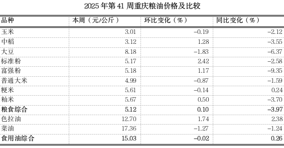 根据市农信中心对我市各区县农贸市场10个主要粮油品种价格监测,第41周(2025.10.06~2025.10.12)重庆粮食均价5.12元、食用油均价15.03元(公斤价,以下同),环比分别上浮0.10%、下滑0.02%,均表现平稳,同比分别下跌3.97%、上浮0.26%。随着中秋、国庆节日效应逐渐退去,粮油市场将回归平稳,综合各级储备粮轮换及主产区晚稻节后大批量上市,新陈稻米供应均明显增加,价格将平稳运行。分品种看,4涨2跌4平稳。其中中稻收购价,标准粉、富强粉、色拉油零售价分别略涨1.28%、2.42%、1.17%、1.74%,大豆、菜油零售价分别略跌1.83%、1.27%。其余粮油品种延续平稳态势。