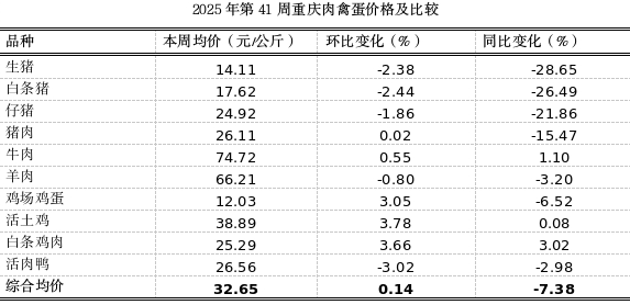 据市农信中心对我市各区县农贸市场10个主要肉禽蛋品种监测,第41周重庆市肉禽蛋均价32.65元,环比平稳,涨0.14%,同比明显下跌7.38%。本周重庆猪肉市场仍然处于低位。供应端,当前市场生猪出栏量保持高位,生猪供应较为充足,与全国的趋势一致。需求端,消费需求仍然平淡,终端消费需求缺乏强有力的支撑,节后(如中秋、国庆后)可能重新进入传统消费淡季,导致鲜品猪肉走货缓慢。预计短期内重庆猪肉价格仍将维持偏弱运行的格局。本周猪肉零售价上浮0.02%,生猪收购价、白条猪批发价、仔猪零售价分别下跌2.38%、2.44%、1.86%,猪粮比4.69:1(低于盈亏平衡点6:1),环比小幅下跌2.05%,同比陡降26.99%。
