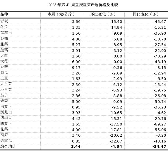 根据市农信中心对我市各区县农贸市场22个地产蔬菜监测品种监测,第41周重庆市蔬菜产地均价3.44元,环比小幅下跌4.84%;同比骤降34.47%。10月地产蔬菜供应以大白菜、莲白等高山蔬菜,以及莴笋、藤菜等绿叶菜类为主。全市蔬菜收获产量超157.4万吨,同比增长2.6%。其中,莲藕、大白菜超10万吨,莲白、辣椒、莴笋、小白菜超8万吨,萝卜、南瓜、姜、瓢白超5万吨。预计短期内产地价格略跌。本周老南瓜、莴笋、花菜、胡萝卜环比分别下跌32.67%、20.62%、17.81%、17.50%。青椒、冬瓜环比分别上涨15.40%、14.94%。其余蔬菜价格波动幅度较小。