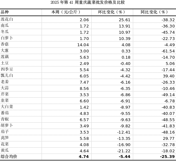 第41周重庆市双福国际农贸城蔬菜批发上市量(去粤菜)4.53万吨,环比小幅减少5.49%,同比明显减少17.58%。22个蔬菜监测品种批发均价4.74元,环比小幅下跌5.44%,5涨14跌3平稳;同比明显下跌25.39%。随着双节节日效应的褪去,批发市场供销情况逐步回稳。同时,以高山蔬菜为主的本地蔬菜供应增加。其中,莲花白、老南瓜环比分别上涨25.61%、13.91%;黄瓜、花菜环比分别下跌21.22%、16.90%。其余蔬菜价格波动幅度较小。