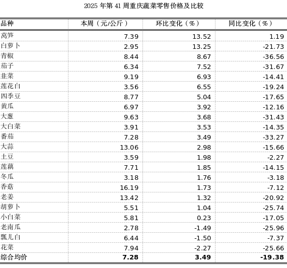 第41周重庆市各区县农贸市场22个蔬菜监测品种零售均价7.28元,环比略涨3.49%,同比大幅下跌19.38%。本周零售市场萝卜、莴笋等本地新鲜蔬菜的上市略微拉高蔬菜整体价格。其中,莴笋、白萝卜环比分别上涨13.52%、13.25%;花菜略跌2.27%。其余蔬菜价格波动较小。