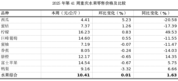 第41周我市各区县农贸市场9个大宗、时令水果监测品种总体零售均价10.41元,环比持平,同比上浮1.63%,表现平稳。10月以来苹果、柑橘等大宗水果开始批量上市,成为市场供应消费的主力。本地上市供应的柑橘以潼南等地的柠檬为主,受上半年异常天气影响,同比减产超10%,价格预计持续高位。西瓜产季结束,供应量减少,价格环比小幅上涨5.23%。鸭梨环比略跌3.32%。其余水果价格保持平稳。