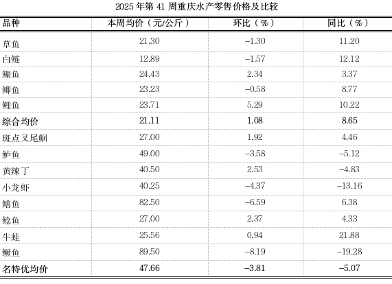 据市农业农村委监测,第41周重庆大宗水产零售均价21.11元,环比稳中略涨1.08%,同比上涨8.65%,名特优水产均价47.66元,环比下跌3.81%,同比下跌5.07%。