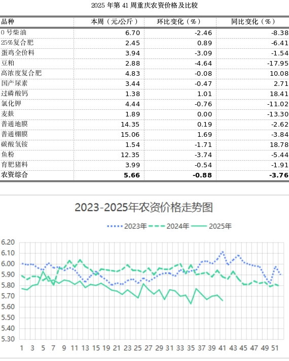 根据市农信中心对全市各区县农贸市场15种主要农资监测,第41周重庆市农资总体均价5.71元,环比下滑0.88%、表现平稳;同比下跌3.76%。据市气象台预报下周阴雨天气较多,气温骤降,最低温度15-22度,最高温度24-28度。随着气温的逐渐降低,应重点加强果树、花卉苗木的整形修剪和秋季繁殖工作。本周过磷酸钙价格略涨1.01%;碳酸氢铵跌1.71%;其余化肥价格平稳。普通地膜价格基本平稳、普通棚膜价格回升1.69%。近期养殖业要严防风、寒、湿的侵袭,加大通风换气,特别要注意畜禽圈舍晚间的保温工作。豆粕、鱼粉价格分别跌4.64%、3.74%;麦麸、育肥猪料价格平稳。蛋鸡全价料价格跌3.09%。0号柴油价格跌2.46%。
