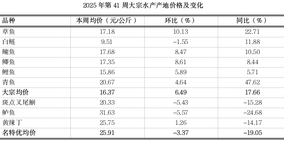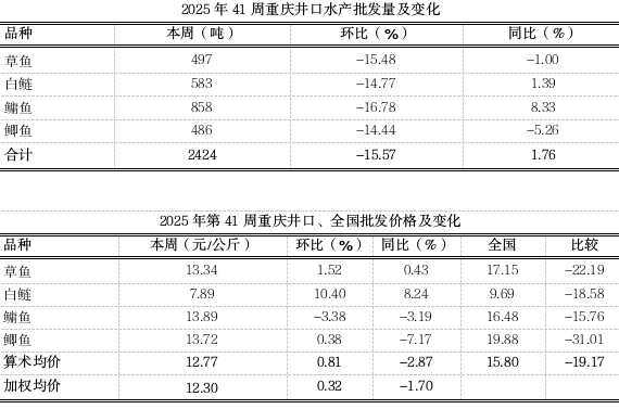 据市农业农村委监测,第41周重庆大宗水产产地均价16.37元/公斤,环比上涨6.49%,同比上涨17.66%。随着气温逐渐下降,运输损耗成本降低,湖北等外地低价鱼流通量增加,本地鱼价格受到一定挤压,双节消费拉动不及预期,加之饲料价格连续上涨,养殖成本增加,养殖户出鱼意愿增强,市场供应量显著增加,前期大宗水产价格持续下行,由于近期出鱼量逐渐减少,市场价格短期回调。名特优水产均价25.91元/公斤,环比下跌3.37%,同比下跌19.05%。名特优水产品由于消费结构调整、节日消费偏好、供应量相对有限等原因,价格波动程度相对较小。后期逐渐进入消费淡季,预计水产价格将稳中有跌。