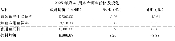 据市农业农村委监测,第41周水产饲料均价9666.67元/吨,环比上涨3.25%,同比下跌3.33%。其中黄颡鱼专用鱼饲料下跌3.06%,鲈鱼专用鱼饲料上涨8.00%,普通鱼饲料上涨3.69%。
