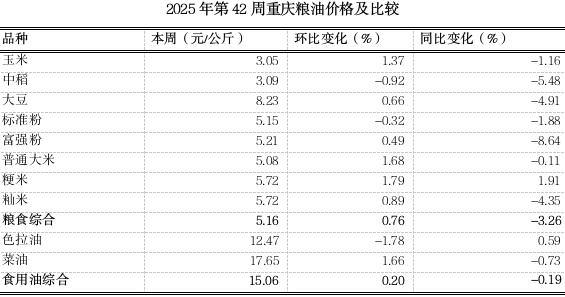 根据市农信中心对我市各区县农贸市场10个主要粮油品种价格监测,第42周(2025.10.13~2025.10.19)重庆粮食均价5.16元、食用油均价15.06元(公斤价,以下同),环比分别上浮0.76%、下滑0.20%,均表现平稳。同比分别下跌3.26%、0.19%。各地加快推进粮食收获,秋种陆续展开,综合各级储备粮轮换及主产区晚稻节后大批量上市,新陈稻米供应均明显增加,价格将平稳运行。分品种看,4涨1跌5平稳。其中玉米批发价,普通大米、粳米、菜油零售价分别略涨1.37%、1.68%、1.79%、1.66%,色拉油零售价略跌1.78%。其余粮油品种延续平稳态势。