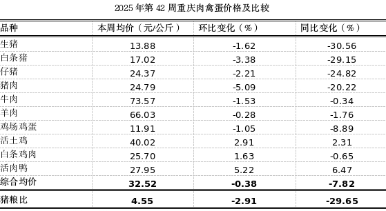 据市农信中心对我市各区县农贸市场10个主要肉禽蛋品种监测,第42周重庆市肉禽蛋均价32.52元,环比平稳,跌0.38%,同比明显下跌7.82%。本周重庆猪肉市场呈现供应宽松而需求平淡的态势,仍然处于低位运行。供应端,当前市场生猪出栏量保持稳定,市场猪源供应充足,与全国的趋势一致。需求端,当前处于猪肉消费淡季,家庭消费增量有限,难以对价格形成有力支撑。预计短期内重庆猪肉价格仍将维持偏弱运行的格局。本周生猪收购价、白条猪批发价、仔猪零售价、猪肉零售价分别下跌1.62%、3.38%、2.21%、5.09%,猪粮比4.55:1(低于盈亏平衡点6:1),环比小幅下跌2.91%,同比陡降29.65%。