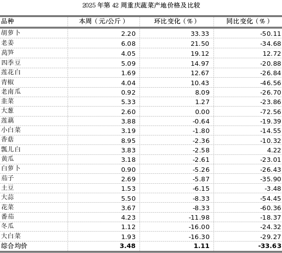 根据市农信中心对我市各区县农贸市场22个地产蔬菜监测品种监测,第42周重庆市蔬菜产地均价3.48元,环比上浮1.11%,表现平稳;同比骤降33.63%。本周地产蔬菜供应以大白菜、莲白等高山蔬菜,以及莴笋、藤菜等绿叶菜类为主。本地蔬菜供应整体呈量足价稳态势。其中,胡萝卜、老姜环比分别上涨33.33%、21.50%;大白菜、冬瓜、番茄环比分别下跌16.30%、16.00%、11.98%。其余蔬菜价格波动幅度较小。