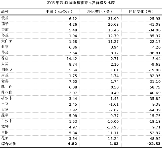 第42周重庆市双福国际农贸城蔬菜批发上市量(去粤菜)5.23万吨,环比明显增加15.57%,同比略减3.74%。22个蔬菜监测品种批发均价4.82元,环比上浮1.63%,表现平稳;同比大幅下跌22.53%。随着气温逐渐降低,本周双福市场秋冬季蔬菜供应增加,居民蔬菜消费开始进入淡季,批发价格整体维稳。其中,黄瓜、茄子因生长季节性因素处于供应淡季,环比分别上涨31.90%、20.68%;花菜、青椒环比分别下跌13.24%、11.11%。其余蔬菜价格波动幅度较小。