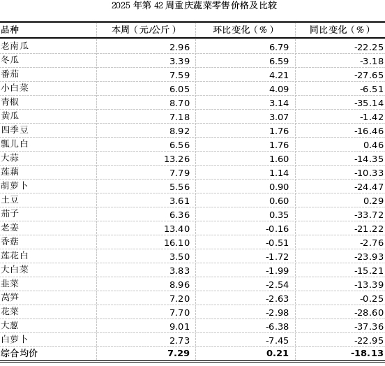 第42周重庆市各区县农贸市场22个蔬菜监测品种零售均价7.29元,环比上浮0.21%,表现平稳;同比明显下跌18.13%。本周零售市场供应量丰富,价格整体稳定,所有品种波动均不大。其中,老南瓜、冬瓜环比分别上涨6.79%、6.59%;白萝卜、大葱环比分别下跌7.45%、6.38%。其余蔬菜价格波动较小。