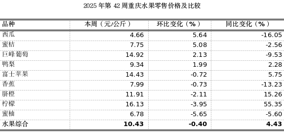 第42周我市各区县农贸市场9个大宗、时令水果监测品种总体零售均价10.43元,环比下滑0.40%、表现平稳,同比小幅上涨4.43%。10月以来,来自南方地区的柑橘类大宗水果福建琯溪蜜柚、云南蜜桔等开始批量上市,成为市场供应消费的主力,本地上市供应的柑橘以潼南等地的柠檬为主。本周蜜柚、柠檬、脐橙环比分别跌5.64%、3.95%、2.11%;西瓜、蜜桔环比分别涨5.64%、5.08%。其余水果价格保持平稳。