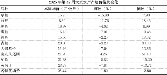 据市农业农村委监测,第42周重庆大宗水产产地均价15.46元,环比下跌7.04%,同比上涨12.36%。随着气温逐渐下降,养殖户出鱼意愿增强,市场供应量显著增加,同时湖北等外地低价鱼大量进入市场,本地鱼价格受到一定挤压,加之近期消费需求无明显提振,大宗水产价格整体下行。名特优水产均价25.44元,环比稳中略跌1.82%,同比小幅下跌2.80%。名特优水产品由于消费结构调整、消费偏好、供应量相对有限等原因,价格波动程度相对较小。后期逐渐进入消费淡季,预计水产价格将稳中有跌。
