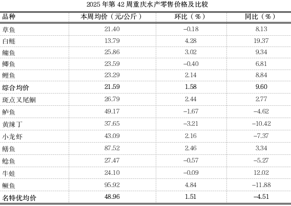 据市农业农村委监测,第42周重庆大宗水产零售均价21.59元,环比稳中略涨1.58%,同比上涨9.60%,名特优水产均价48.96元,环比稳中略涨1.51%,同比下跌4.51%。