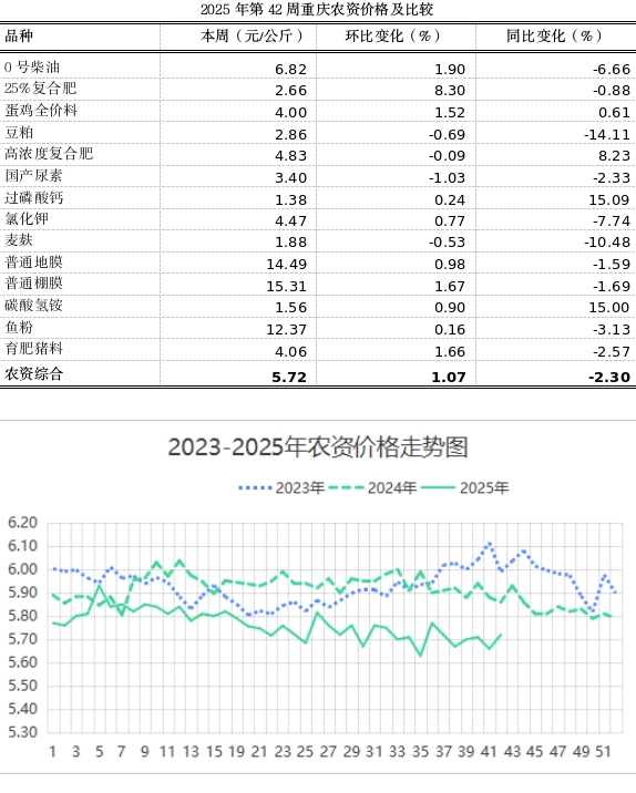 根据市农信中心对全市各区县农贸市场15种主要农资监测,第42周重庆市农资总体均价5.72元,环比稳中略涨1.07%;同比下跌2.30%。据市气象台预报下周阴雨天气较多,气温骤降,最低温度10-16度,最高温度16-20度。随着气温的逐渐降低,应重点加强果树、花卉苗木的整形修剪和秋季繁殖工作。本周25%复合肥涨8.30%,国产尿素略跌1.03%,其余化肥价格平稳。普通地膜、普通棚膜价格回升0.98%、1.67%。近期养殖业要严防风、寒、湿的侵袭,特别要注意畜禽圈舍晚间的保温工作。豆粕、麦麸、鱼粉价格平稳,育肥猪料价格略涨1.66%。蛋鸡全价料价格回升1.52%。0号柴油价格涨1.90%。