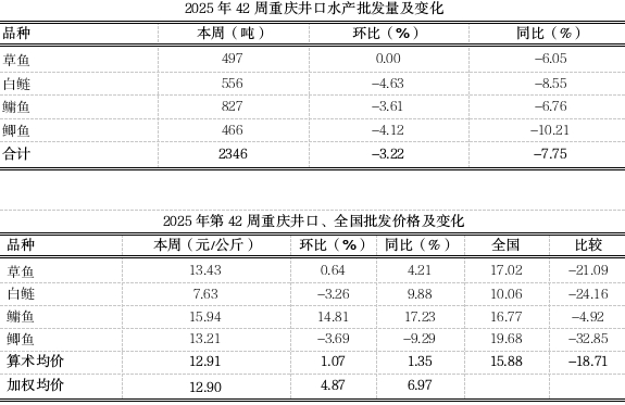 据市农业农村委监测,第42周重庆大宗水产产地均价15.46元/公斤,环比下跌7.04%,同比上涨12.36%。随着气温逐渐下降,养殖户出鱼意愿增强,市场供应量显著增加,同时湖北等外地低价鱼大量进入市场,本地鱼价格受到一定挤压,加之近期消费需求无明显提振,大宗水产价格整体下行。名特优水产均价25.44元/公斤,环比稳中略跌1.82%,同比小幅下跌2.80%。名特优水产品由于消费结构调整、消费偏好、供应量相对有限等原因,价格波动程度相对较小。后期逐渐进入消费淡季,预计水产价格将稳中有跌。