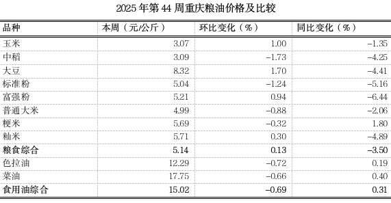 根据市农信中心对我市各区县农贸市场10个主要粮油品种价格监测,第44周(2025.10.27~2025.11.02)重庆粮食均价5.14元、食用油均价15.02元(公斤价,以下同),环比分别上浮0.13%、下滑0.69%,均表现平稳;同比分别下跌3.50%、上浮0.31%。粮油市场平稳运行,综合各级储备粮轮换及主产区晚稻大批量上市,价格将呈稳中偏弱态势。分品种看,2涨2跌6平稳。其中玉米批发价、大豆零售价分别略涨1.00%、1.70%,中稻收购价、标准粉零售价略跌1.73%、1.24%。其余粮油品种延续平稳态势。