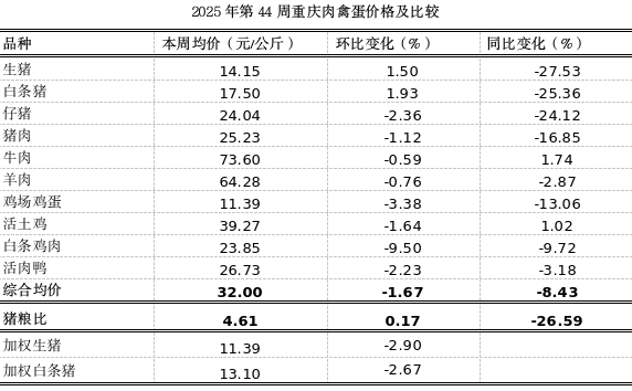 据市农信中心对我市各区县农贸市场10个主要肉禽蛋品种监测,第44周重庆市肉禽蛋均价32.00元,环比稳中略跌,跌1.67%,同比明显下跌8.43%。本周重庆猪肉市场呈现震荡偏弱的态势。供应端,能繁母猪存栏量处于高位,预示着中远期供应基础依然稳固,与全国的趋势一致。需求端,处于消费淡季向旺季过渡期,天气转凉,居民猪肉消费量逐步回升,但尚未到腌腊、春节备货高峰期,需求增幅有限。本周生猪收购价、白条猪批发价分别上涨1.50%、1.93%,仔猪零售价、猪肉零售价分别下跌2.36%、1.12%,猪粮比4.61:1(低于盈亏平衡点6:1),环比平稳,涨0.17%,同比陡降26.59%。