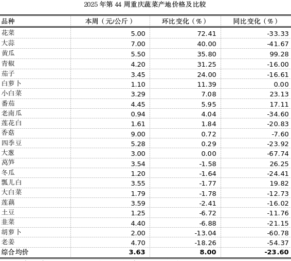 根据市农信中心对我市各区县农贸市场22个地产蔬菜监测品种监测,第44周重庆市蔬菜产地均价3.63元,环比上涨8.00%;同比大幅下跌23.60%。10月以来,我市产地蔬菜进入换茬季,本地蔬菜以萝卜类、白菜类、甘蓝类、绿叶菜类为主。受气温走低及连续阴雨天气影响,产地蔬菜采摘、管理、运输等成本上升,部分品种价格涨幅较为明显。其中,花菜、大蒜、黄瓜、青椒环比分别上涨72.41%、40.00%、35.80%、31.25%;老姜、胡萝卜环比分别下跌18.26%、13.04%。其余蔬菜价格波动幅度较小。