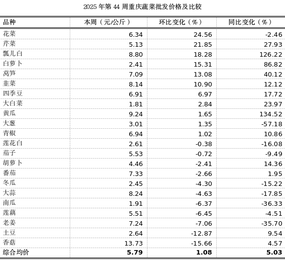 第44周重庆市各区县农贸市场22个蔬菜监测品种零售均价7.65元,环比小幅上涨5.30%;同比下跌9.18%。其中,花菜、四季豆、黄瓜环比分别上涨16.26%、14.04%、10.21%。其余蔬菜价格波动较小。