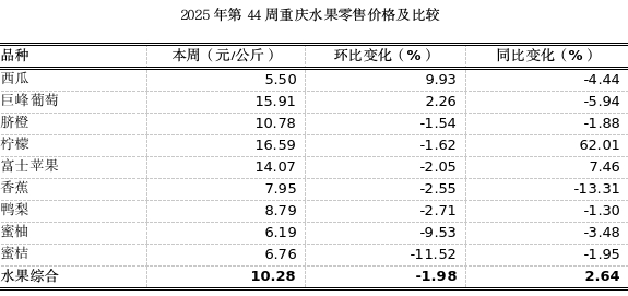 第44周我市各区县农贸市场9个大宗、时令水果监测品种总体零售均价10.28元,环比下滑1.98%、表现平稳,同比略涨2.64%。随着气温的降低,柑橘类大宗水果成为市场供应消费的主力,来自南方地区如福建琯溪蜜柚、云南蜜桔等大批量上市且品种丰富,本地柑橘开始逐渐成熟上市。本周蜜桔、蜜柚环比价格分别下跌11.52%、9.53%。鸭梨、香蕉、富士苹果大众水果环比分别略跌2.71%|、2.55%、2.05%。西瓜、巨峰葡萄已过销售旺季,市场供应减少,价格环比分别涨9.93%、2.26%。其余水果价格波动幅度较小。