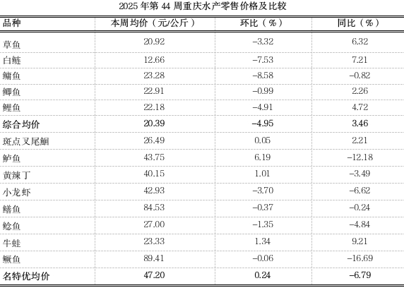 据市农业农村委监测,第44周重庆大宗水产零售均价20.39元,环比下跌4.95%,同比上涨3.46%,名特优水产均价47.20元,环比上浮0.24%、表现平稳,同比下跌6.79%。
