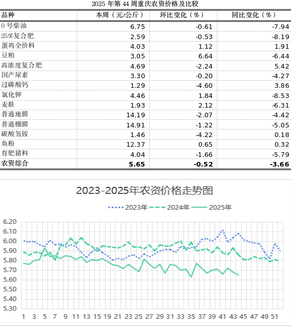根据市农信中心对全市各区县农贸市场15种主要农资监测,第44周重庆市农资总体均价5.65元,环比下滑0.52%、表现平稳;同比下跌3.66%。据市气象台预报下周前期多云见晴,后期阴雨,气温逐渐走低,最低温度6度,最高温度19度。建议农户每15~20天检查一次“三沟”,及时清理沟内淤泥、杂草,确保排水通畅,避免冬前连阴雨导致渍害烂根。本周高浓度复合肥、过磷酸钙、碳酸氢铵分别跌2.24%、4.60%、4.22%;氯化钾价格略涨1.84%,其余化肥价格平稳。普通地膜、普通棚膜价格分别跌2.07%、1.22%。近期养殖业要严防风、寒、湿的侵袭,特别要注意畜禽圈舍晚间的保温工作。豆粕、麦麸价格分别涨6.64%、2.12%;育肥猪料价格跌1.66%;鱼粉价格平稳。蛋鸡全价料价格略涨1.12%。0号柴油价格下滑0.61%、表现平稳。