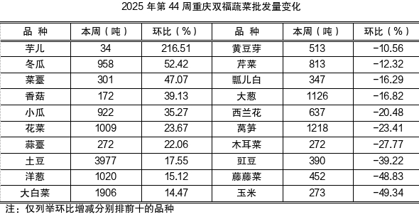 第44周蔬菜批发量表现21增20减2平稳,总批发上市量48562.49吨,环比上浮0.06%、表现平稳,同比小幅减少5.32%。其中,大宗蔬菜批发品种(周批发总量超过700吨)27个,批发量43109.27吨,环比上浮1.17%、表现平稳,同比减少8.81%,占总批发量的88.77%。大宗品种排名前10的品种:莲花白4091吨、土豆3977吨、白萝卜3670吨、莲藕2593吨、青椒2557吨、番茄2397吨、老姜2228吨、大白菜1906吨、四季豆1681吨、洗葱1433吨。(增减幅前十位品种见下表)