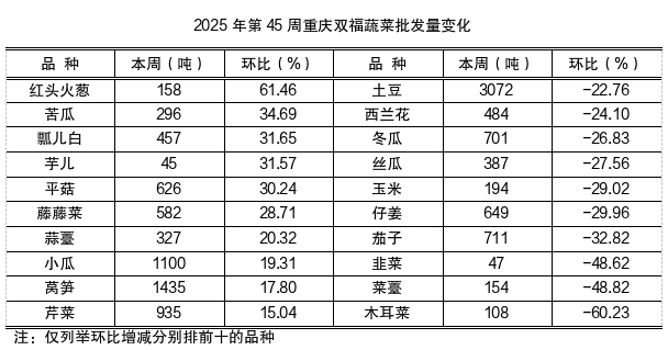 第45周蔬菜批发量表现24减17增2平稳,总批发上市量45468.22吨,环比减少6.37%,同比明显减少12.31%。其中,大宗蔬菜批发品种(周批发总量超过700吨)26个,批发量39529.50吨,环比减少8.30%,同比明显减少18.91%,占总批发量的86.94%。大宗品种排名前10的品种:莲花白3845吨、白萝卜3734吨、土豆3072吨、青椒2416吨、莲藕2350吨、番茄1970吨、老姜1942吨、四季豆1875吨、大白菜1571吨、洗葱1533吨。(增减幅前十位品种见下表)