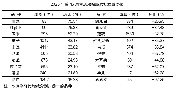 第46周蔬菜批发价格环比37涨3跌4平稳,总体算术批发均价6.55元(为公斤价,以下同),环比上涨6.50%,同比大幅上涨25.48%。总体加权批发均价5.50元,环比上涨9.30%,同比大幅上涨27.27%。具体表现,环比涨幅较大的品种及价格变化:南瓜1.96元,环比陡升32.43%;大白菜2.16元、芋儿6.15元、白萝卜2.36元,环比分别大幅上涨29.34%、23.49%、20.41%;冬瓜、洋葱、红小米辣、花菜、茭白、蒜薹、红萝卜、茄子、番茄、红苕、玉米、胡萝卜、莲花白、藤藤菜、土豆、青椒、韭菜、红头火葱、莲藕,环比分别明显上涨18.44%、18.04%、16.43%、16.37%、16.29%、16.20%、16.15%、16.10%、15.15%、14.69%、13.89%、13.14%、13.03%、12.31%、11.74%、11.73%、11.52%、10.28%、10.17%。环比跌幅较大的品种及价格变化:菜薹,环比明显下跌10.48%。(增减幅前十位品种见下表)