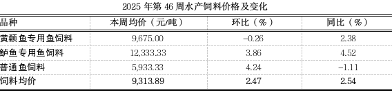 据市农业农村委监测,第46周水产饲料均价9313.89元/吨,环比小幅上涨2.47%,同比小幅上涨2.54%。其中黄颡鱼专用鱼饲料平稳,鲈鱼专用鱼饲料上涨3.86%,普通鱼饲料上涨4.24%。
