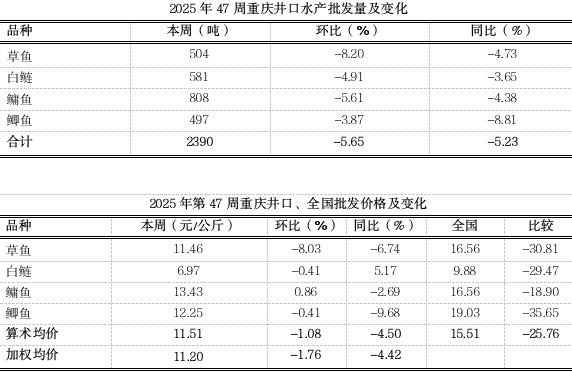 据市农业农村委监测,第47周重庆大宗水产零售均价20.79元/公斤,环比稳中略涨1.04%,同比上涨7.00%,名特优水产均价45.76元/公斤,环比下滑0.19%、表现平稳,同比下跌7.49%。