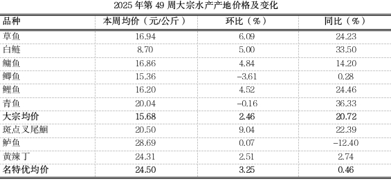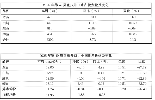 据市农业农村委监测,第49周重庆大宗水产产地均价15.68元/公斤,环比小幅上涨2.46%,同比上涨20.72%。名特优水产均价24.50元/公斤,环比上涨3.25%,同比上浮0.46%、表现平稳。前期气温降低,运输损耗成本降低,大宗淡水鱼集中上市,供应量充足,同时湖北等外地低价鱼大量进入市场,本地鱼价格受到一定挤压,大宗水产价格主要以跌为主,加之进入冬季传统餐饮消费淡季,批发渠道采购以刚需为主,难以支撑价格回升。近期由于存塘结构调整,水产价格温和回调。后期水产迎来“年末收官期”,叠加资金回笼、塘租缴纳等多重因素影响,迎来集中出鱼高峰,价格或将持续承压。