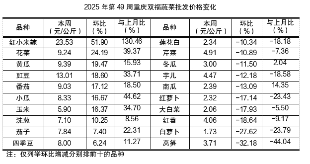 第49周蔬菜批发价格环比22跌15涨5平稳,总体算术批发均价6.73元(为公斤价,以下同),环比略涨3.54%,同比大幅上涨22.59%。总体加权批发均价5.67元,环比略涨2.43%,同比大幅上涨27.00%。具体表现,环比跌幅较大的品种及价格变化:莴笋3.71元,环比骤降32.18%;白萝卜1.73元,环比大幅下跌27.62%;红苕、大白菜、红萝卜、南瓜、芋儿、冬瓜、芹菜、莲花白,环比分别明显下跌18.64%、17.93%、17.14%、13.09%、12.18%、11.50%、10.89%、10.34%。环比涨幅较大的品种及价格变化:红小米辣23.53元,环比陡升51.90%;花菜9.24元,环比大幅上涨24.19%;黄瓜、豇豆、番茄、小瓜、玉米、洗葱,环比分别明显上涨19.47%、18.60%、17.12%、16.67%、16.37%、10.25%。(增减幅前十位品种见下表)