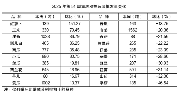 第51周蔬菜批发量表现18减17增7平稳,总批发上市量37852.74吨,环比下滑1.29%、表现平稳,同比明显减少15.53%。其中,大宗蔬菜批发品种(周批发总量超过700吨)22个,批发量31602.46吨,环比下滑1.69%、表现平稳,同比大幅减少21.77%,占总批发量的83.49%。大宗品种排名前10的品种:土豆3737吨、白萝卜3028吨、莲花白2383吨、青椒2166吨、番茄1854吨、莴笋1699吨、老姜1562吨、莲藕1489吨、洗葱1479吨、胡萝卜1128吨。(增减幅前十位品种见下表)
