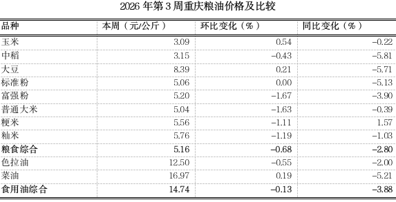 根据市农信中心对我市各区县农贸市场10个主要粮油品种监测,第3周(2026.1.12~2026.1.18)重庆粮食均价5.16元、食用油均价14.74元(公斤价,以下同),环比分别下滑0.68%、0.13%,同比分别下跌2.80%、3.88%。总体来看,国内粮油生产供应稳固,供给总体宽松,随着春节临近市场消费需求逐渐回升,市内粮油市场各品种价格将以稳为主。分品种看4跌6平稳。其中富强粉、普通大米、粳米、籼米零售价分别略跌1.67%、1.63%、1.11%、1.19%,其余粮油品种延续平稳态势。