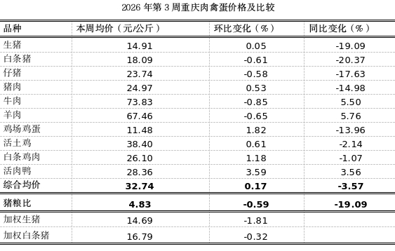 据市农信中心对我市各区县农贸市场10个主要肉禽蛋品种监测,第3周重庆市肉禽蛋均价32.74元,环比平稳,涨0.17%,同比下跌3.57%。本周重庆猪肉市场呈现供应端小幅调整、需求端持续走弱、价格整体以稳为主、局部小幅波动的态势。受元旦后消费回落、腌腊需求进入收尾阶段、北方猪价上涨传导有限等因素影响,重庆猪肉价格未出现大幅波动,与西南地区整体走势基本一致。供应端,规模养殖企业保持稳定的出栏节奏,散户养殖前期压栏的大猪仍在逐步消化,适重猪存栏量依然较高,潜在供应充足。需求端,元旦假期结束后,家庭集中采购需求明显回落,日常鲜销市场交易清淡,腌腊灌肠活动已进入收尾阶段,对猪肉的集中需求大幅减弱,餐饮消费方面冬季餐饮淡季特征明显。预计1月下旬,随着腌腊需求完全结束,猪肉价格可能小幅承压。本周生猪收购价、猪肉零售价分别上涨0.05%、0.53%,白条猪批发价、仔猪零售价分别下跌0.61%、0.58%,猪粮比4.83:1(低于盈亏平衡点6:1),环比下跌0.59%,同比大幅下跌19.09%。