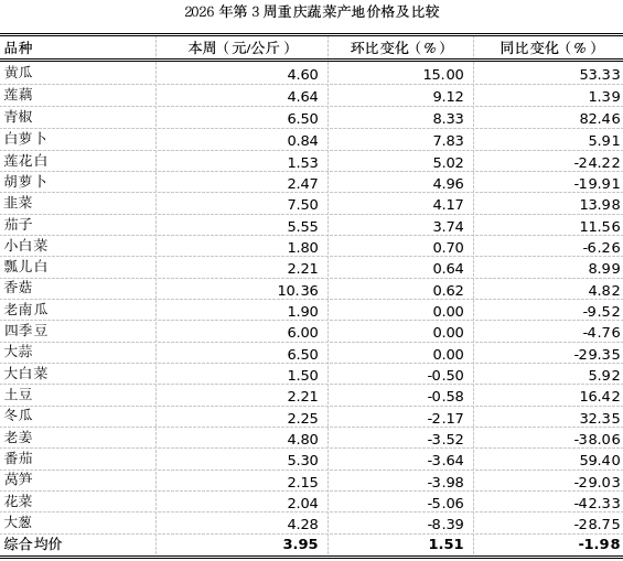 根据市农信中心对我市各区县农贸市场22个地产蔬菜监测品种监测,第3周重庆市蔬菜产地均价3.95元,环比上浮1.51%、表现平稳,同比下滑1.98%,表现平稳。1月,地产蔬菜供应仍以芥菜类、根菜类、甘蓝类、白菜类、绿叶菜类等为主。据农情调度预测,1月全市蔬菜收获产量同比增长1.30%,本地蔬菜生产供应充足。其中,黄瓜、莲藕环比分别上涨15.00%、9.12%;大葱、花菜环比分别下跌8.39%、5.06%。其余蔬菜价格波动幅度较小。