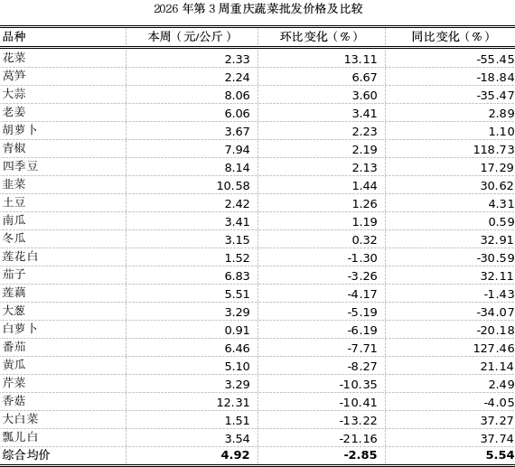 第3周重庆市双福国际农贸城蔬菜批发上市量(去粤菜)3.76万吨,环比小幅增加5.67%;同比明显减少10.79%。22个蔬菜监测品种批发均价4.92元,环比略跌2.85%;同比小幅上涨5.54%。本周双福市场总体交易量略有增加,市场供需关系总体平衡,各品种价格波动处于合理区间。其中,花菜、莴笋环比上涨13.11%、6.67%;瓢儿白、大白菜、香菇、芹菜环比分别下跌21.16%、13.22%、10.41%、10.35%。其余蔬菜价格波动幅度较小。