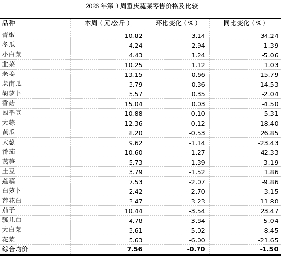 第3周重庆市各区县农贸市场22个蔬菜监测品种零售均价7.56元,环比下滑0.70%,同比下滑1.50%,均表现平稳。本周零售市场供应品种丰富,价格稳定。其中,青椒环比略涨3.14%;花菜环比下跌6.00%。其余蔬菜价格波动较小。