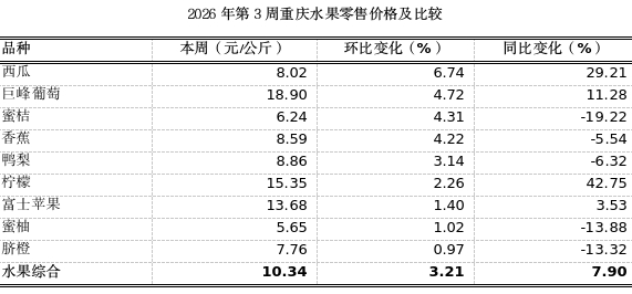 第3周我市各区县农贸市场9个大宗、时令水果监测品种总体零售均价10.34元,环比略涨3.21%,同比上涨7.90%。本周我市天气持续温暖、干燥,水果市场消费需求有所回升。同时,全国多地气温降低、雨雪天气导致仓储冷链、物流运输成本增加。重庆水果市场价格全线回升,走势与全国市场趋同。其中,西瓜、巨峰葡萄、蜜桔、香蕉环比分别上涨6.74%、4.72%、4.31%、4.22%;鸭梨、柠檬环比分别略涨3.14%、2.26%。其余水果品种价格基本平稳。