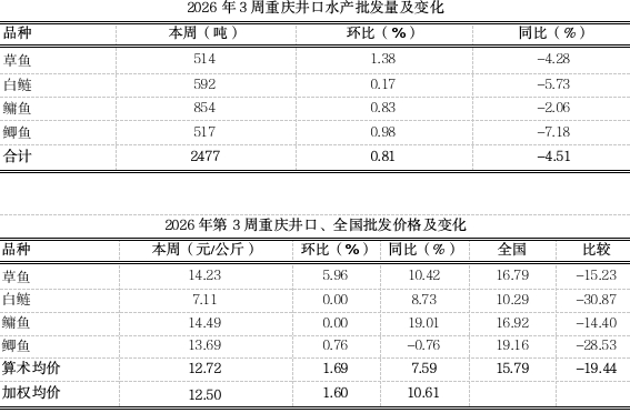 据市农业农村委监测,第3周重庆大宗水产产地均价14.79元,环比稳中略跌1.84%,同比上涨19.37%。名特优水产均价22.55元,环比小幅下跌2.21%,同比稳中略跌1.93%。年后市场消费热度回落,家庭采购与餐饮需求同步收缩,市场流通节奏明显放缓,加之年前处于集中出鱼高峰,存塘量持续消耗,年后存塘收紧,随着气温逐渐降低,近期外地鱼流入增加,本地水产价格整体向下波动。
