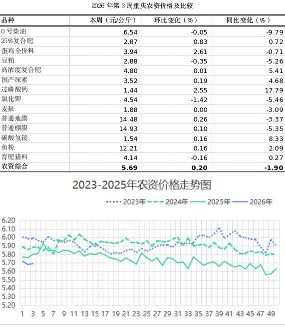 根据市农信中心对全市各区县农贸市场15种主要农资监测,第3周我市农资总体均价5.69元,环比上浮0.20%、表现平稳,同比略跌1.90%。下周重庆阴雨连绵,气温-3-14度之间,中心城区5-14度。本周化肥价格总体平稳,其中过磷酸钙涨2.55%,氯化钾略跌1.42%,其余化肥价格平稳。普通地膜、普通棚膜价格分别上浮0.26%、0.10%,表现平稳。油菜种植需注意防寒:寒潮来临前,喷施0.2%磷酸二氢钾+0.01%芸苔素内酯混合液,每亩兑水30公斤,提升植株抗寒能力;极端低温天气可在田间覆盖稻草、秸秆,减轻冻害。饲料价格总体平稳,蛋鸡全价料上涨2.61%。建议猪、牛、羊等家畜打好防疫针,防范外来疫源感染而引起急性、烈性传染病的发生。0号柴油价格下滑0.05%,价格持续走低。